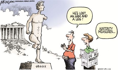 “In Greece the culprit has been rampant tax evasion by corporations owing millions in taxes and self-employed professionals who can hide their earnings, unlike salaried employees and pensioners. Under international pressure to balance its budget, the outgoing Greek government axed salaries and pensions and slapped new taxes on the bulk of citizens who were not tax-delinquent. “